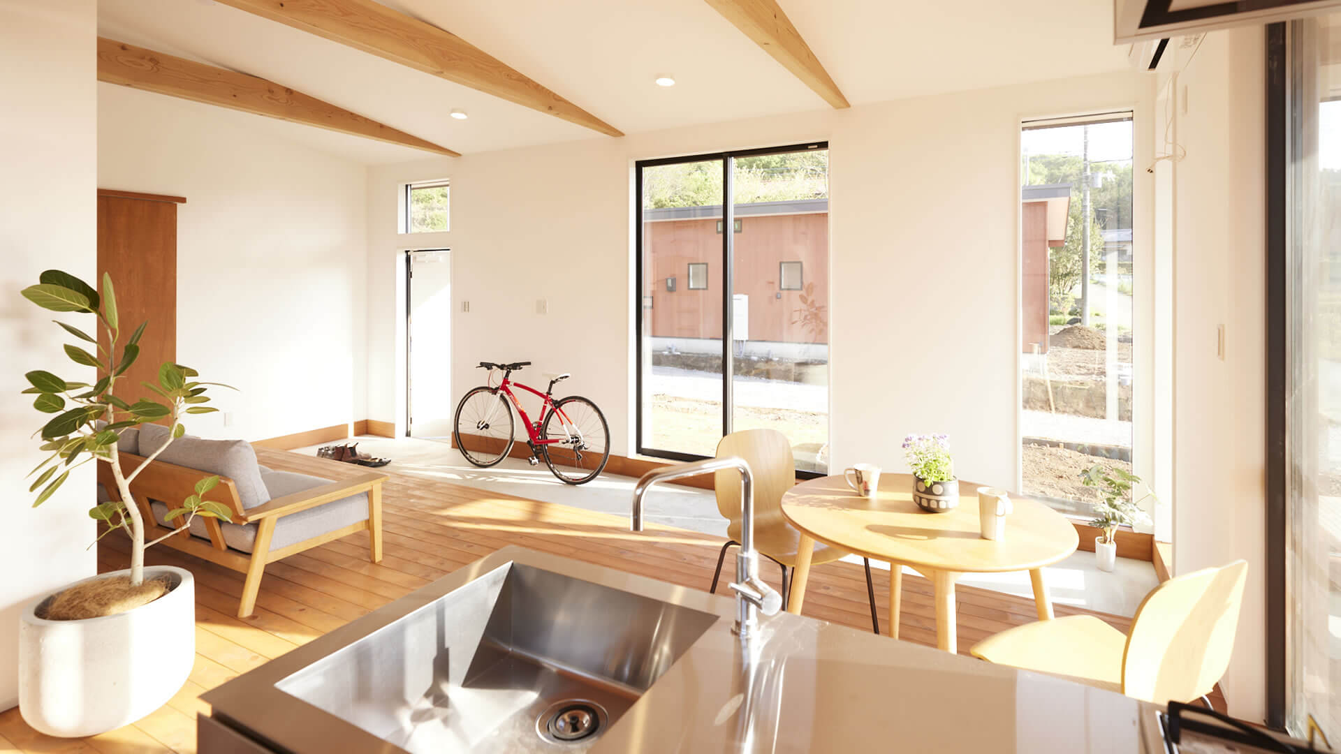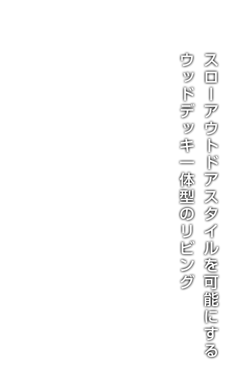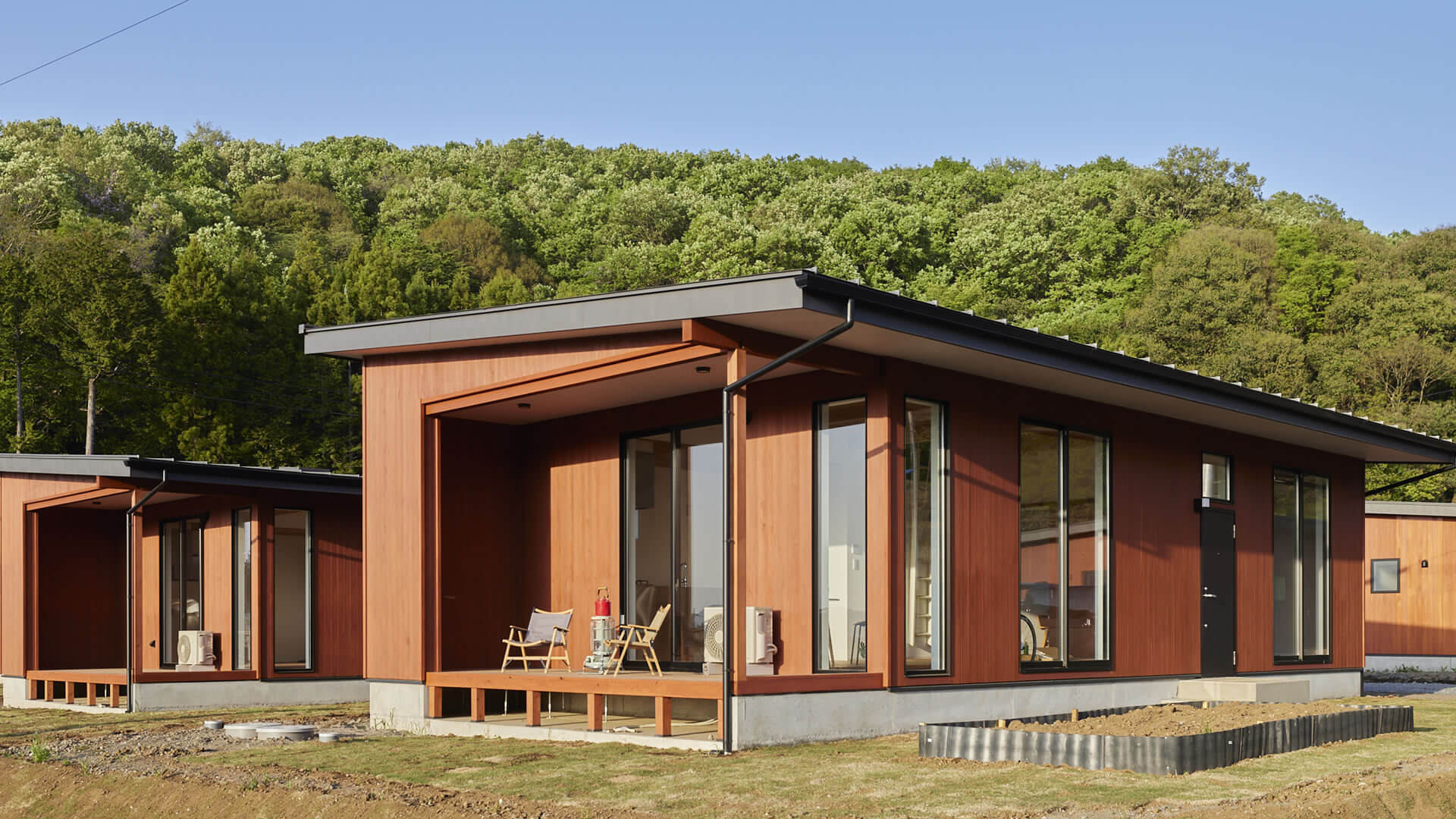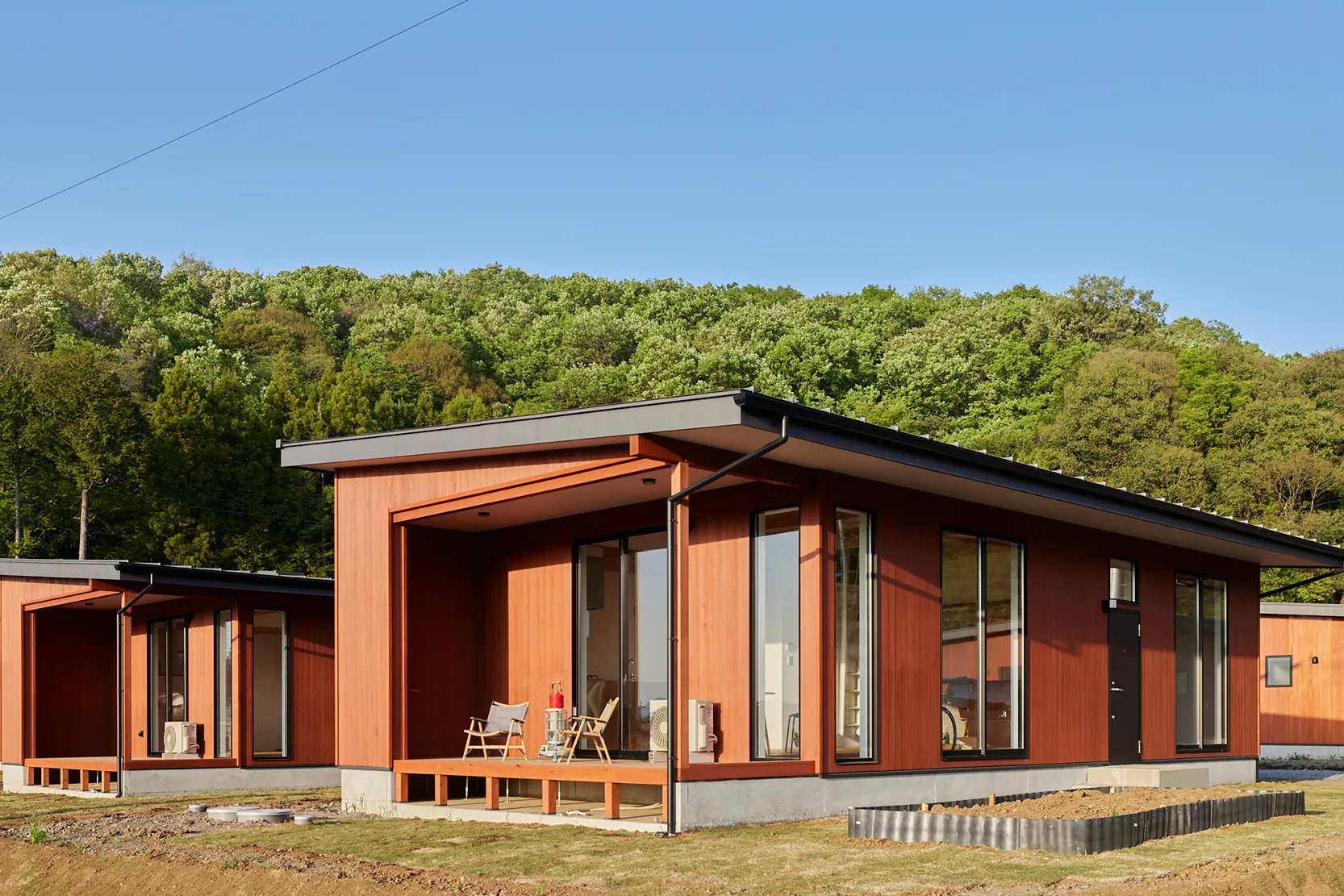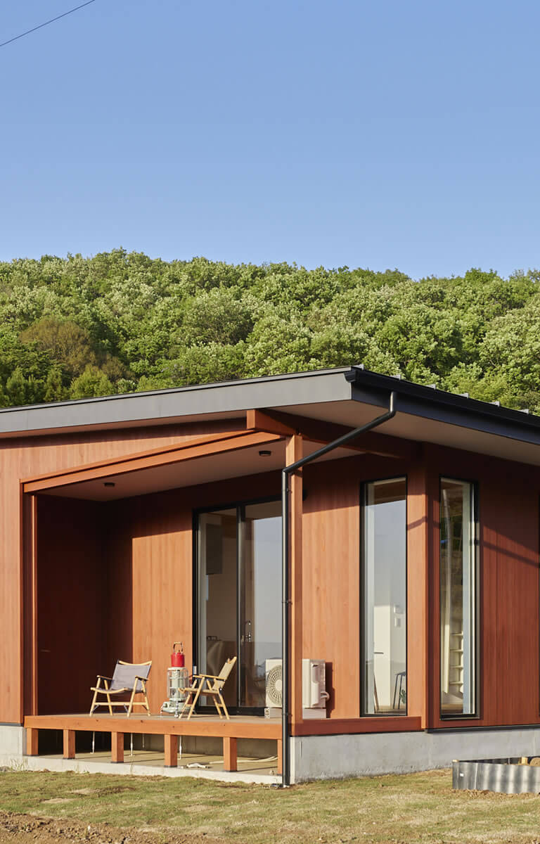 バリアフリーの1LDK~2LDK規模の建物。スローアウトドアスタイルを可能にするウッドデッキ一体型のリビングが特徴。